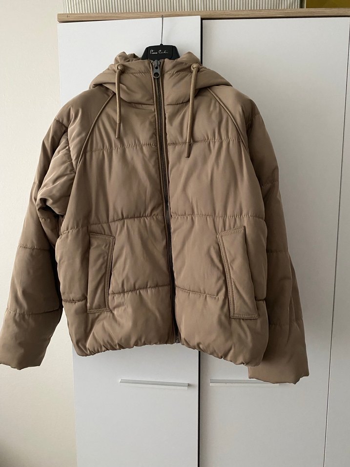 Fermuarlı ve kapüşonlu, uzun kollu bej renkli, yumuşak ve sıcak kumaştan yapılmış kadın mont. Günlük kullanıma uygun, rahat sokak stili