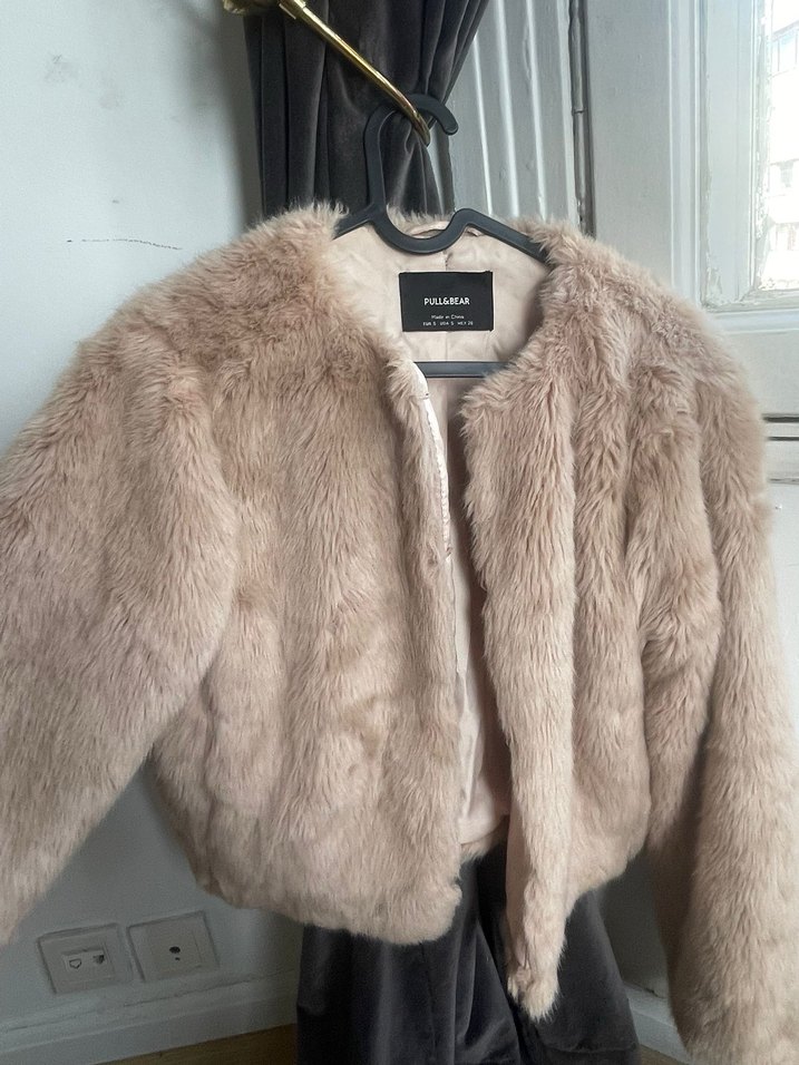 Bej renkli, kürk detaylı, uzun kollu ve normal uzunlukta kadın ceketi. Sokak stiline uygun, rahat ve şık tasarım.