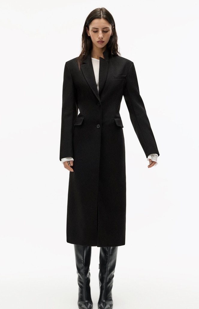 Bu siyah uzun kadın kaban, tek düğmeli kapama ve kapaklı ceplerle şık ve yapısal bir tasarıma sahiptir. Soğuk havalar için uygundur.
