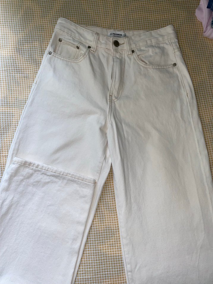 Beyaz pamuk midi kot pantolon, rahat ve düz kesim, sade desensiz tasarım, günlük minimal stil için zahmetsiz şıklık sağlar. 34 beden