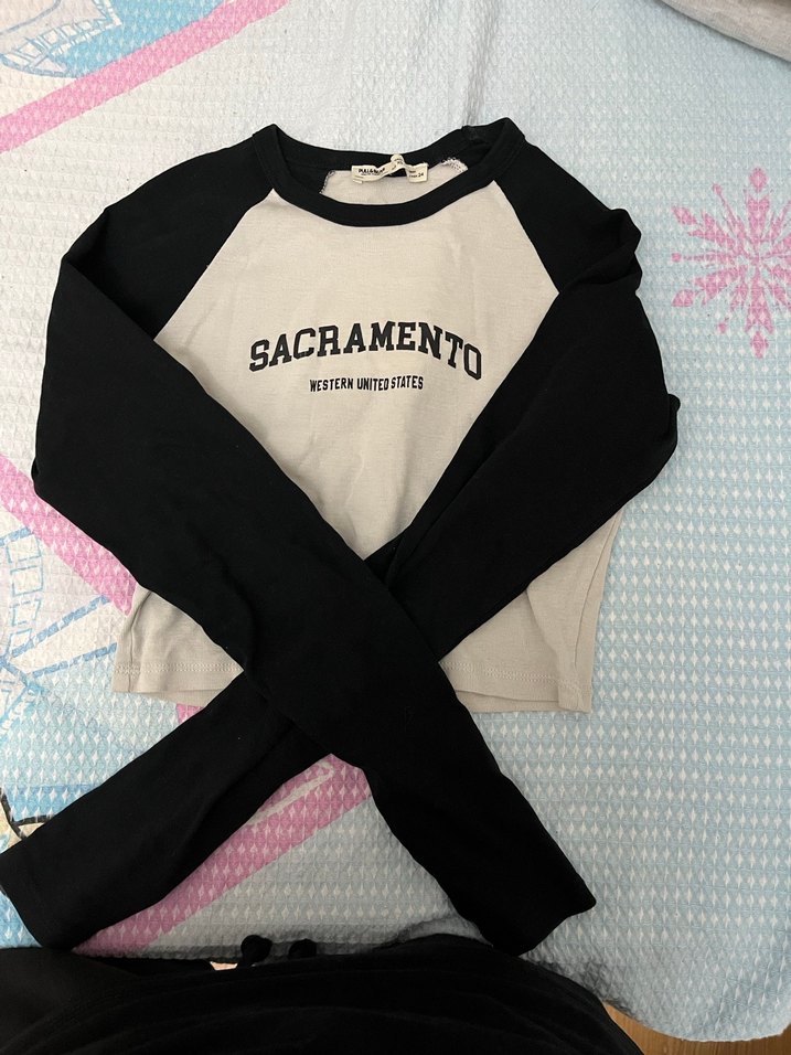 uzun kollu, fitted kesim, yuvarlak yaka ve 'SACRAMENTO' baskılı tişört. Pamuklu kumaştan, koyu kollar ve beyaz gövdeyle rahat ve şık.
