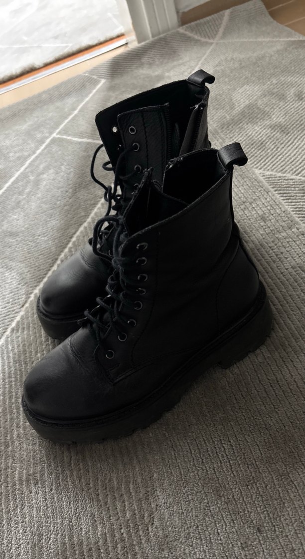 Siyah deri, platform topuklu ve tokalı gotik botlar, rock punk havası ve günlük kullanım için uygundur.