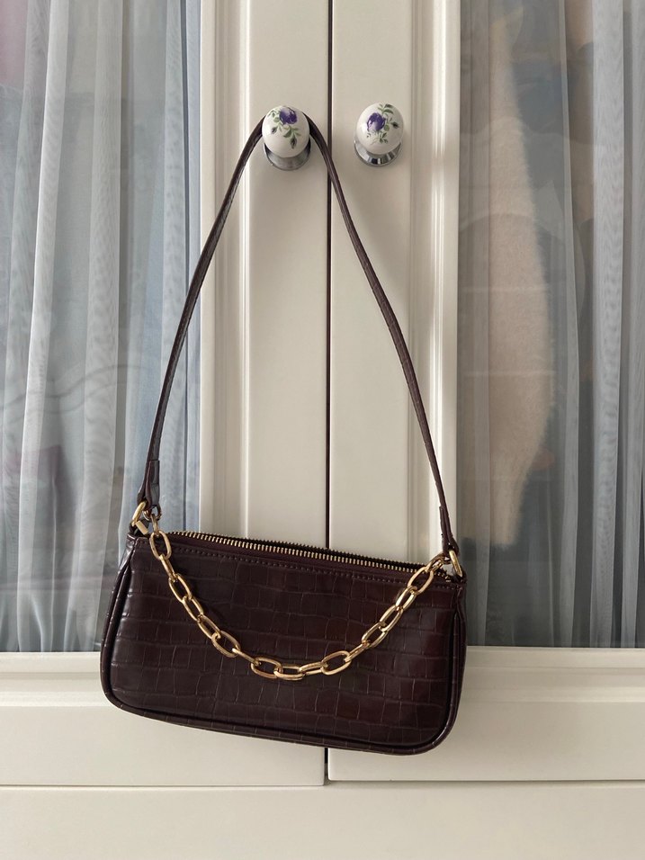 Koyu Bordo renkli, omuzda taşımaya uygun çanta. Zincir detaylıdır. Zincirlerinde hafif deformeler mevcut görsellerde belirttim gözüktüğü gibi