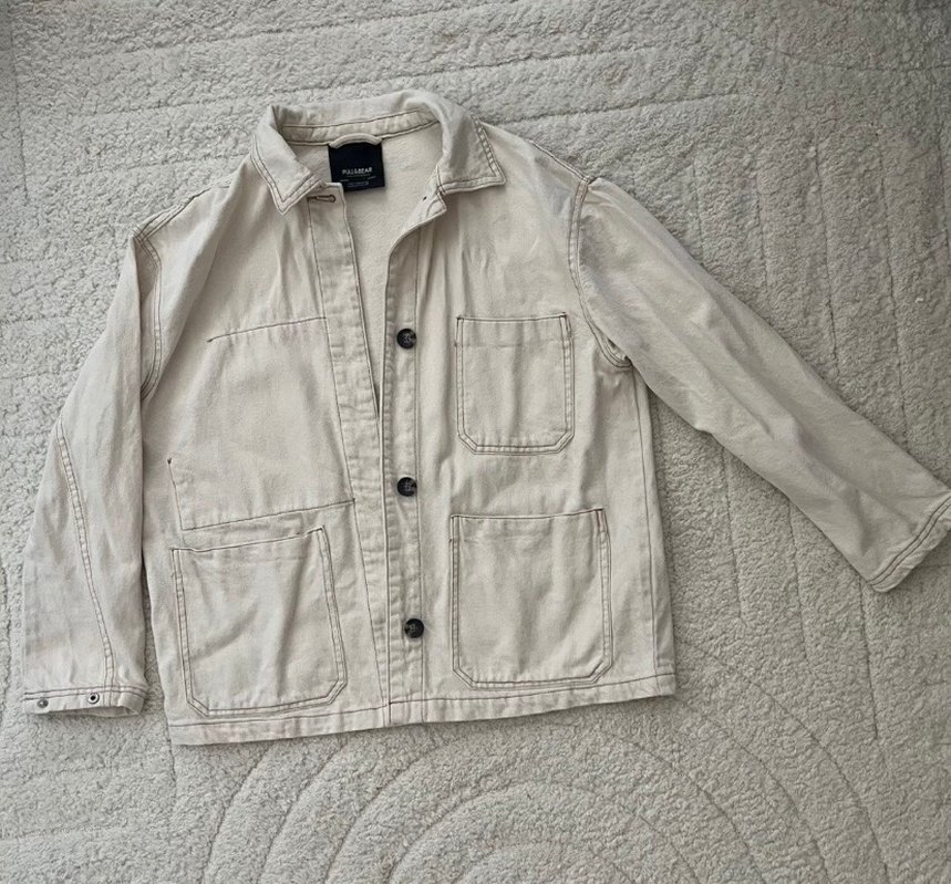 Düğmeli, uzun kollu, bej keten ceket. S beden yazıyo ama oversize M ve L de olur Fotoğrafta belirtilen küçük bir lekesi var fakat gözükmüyor derecede Başka sorunu yok