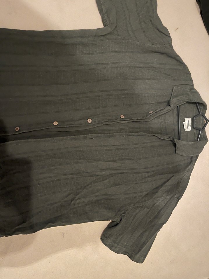 Pull and Bear Düğmeli Kısa Kollu Keten Haki Yeşil Erkek Gömlek