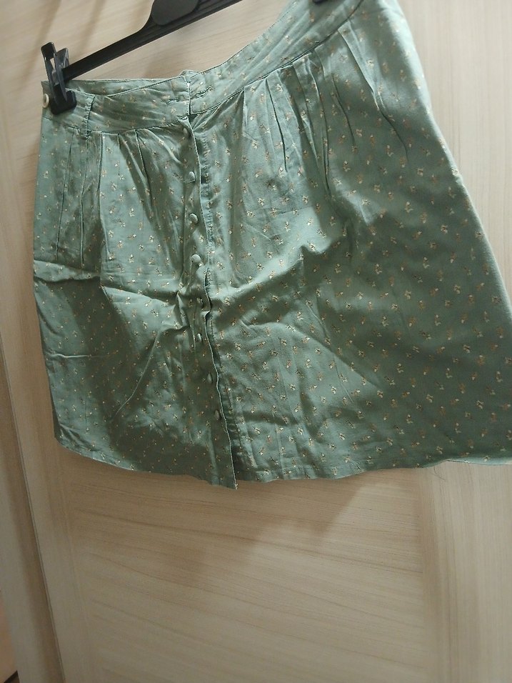 Yeşil pamuk mini etek, düğmeli ve bol kesimdir. Vintage bohem tarzında, günlük kullanıma uygundur.