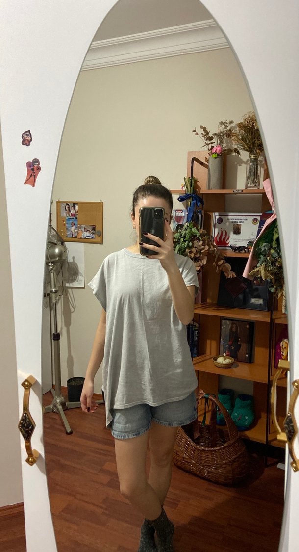 Gri denim kumaştan, kısa kollu, yuvarlak yakalı, normal boy midi uzunluğunda, rahat kesim kadın tişörtü. Günlük kullanıma uygun, zahmetsiz şıklık sunar. Kullanılmadı defosu yok