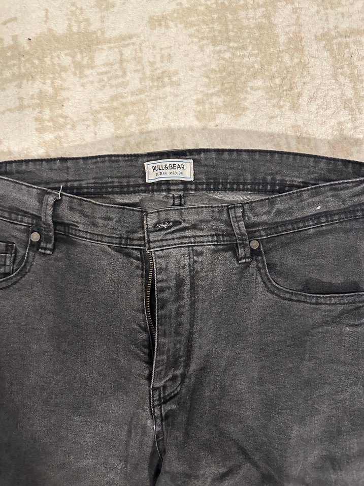 PULL AND BEAR Gri renk, düğmeli, normal boy kesime sahip kadın denim pantolon. Günlük sokak stili için uygundur.