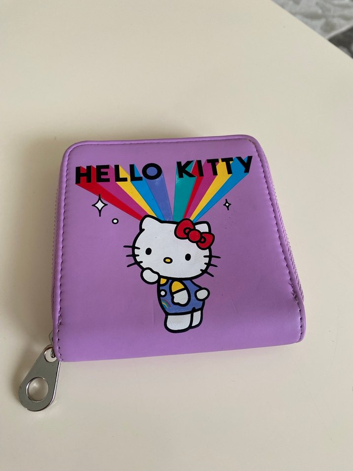 Mor renkte, renkli Hello Kitty baskılı ve fermuarlı plastik cüzdan. Bohem ve retro tarzlara uygun, günlük kullanım için ideal.