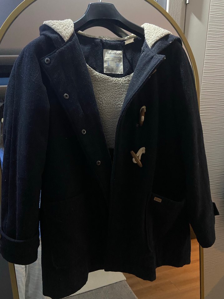 Eski sezon lacivert kaban. Çok sıcak tutuyor ve oldukça sağlam. L-M bedene rahatlıkla olur. Oversize bi kaban. Çok az tüylenme sorunu var.