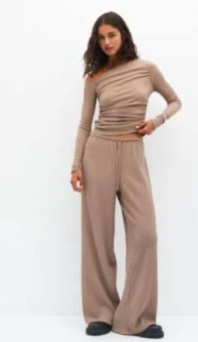 Bej renkli, dokulu kumaştan kadın takım; bol kesim ve uzun paçalı kadın pantolon ve dar kesim üst .Günlük kullanıma uygun, desensiz ve şık görünümlü. Üst L beden, alt S beden. Alt daha bol kalıp, üst daha dar kalıp olduğundan ben de bu şekilde almıştım takımı.