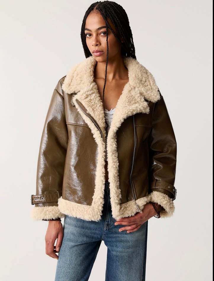 Geçen sene aldım tertemiz duruyor 2 defa kullandım. Bu kahverengi deri ceket parlak yüzeye sahip, yakada, manşetlerde ve iç kısımda kürk detayları bulunur. Geniş kesim, çıtçıtlı yakalı ve askılı kolludur, rahat sokak tarzı için uygundur.