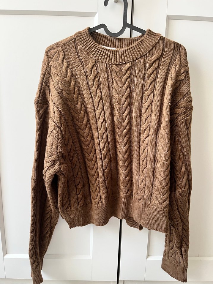 Kahverengi, örgü kumaştan, yuvarlak yakalı ve uzun kollu, bol kesim kadın kazak. Günlük kullanıma uygun, rahat ve trend bir parça.