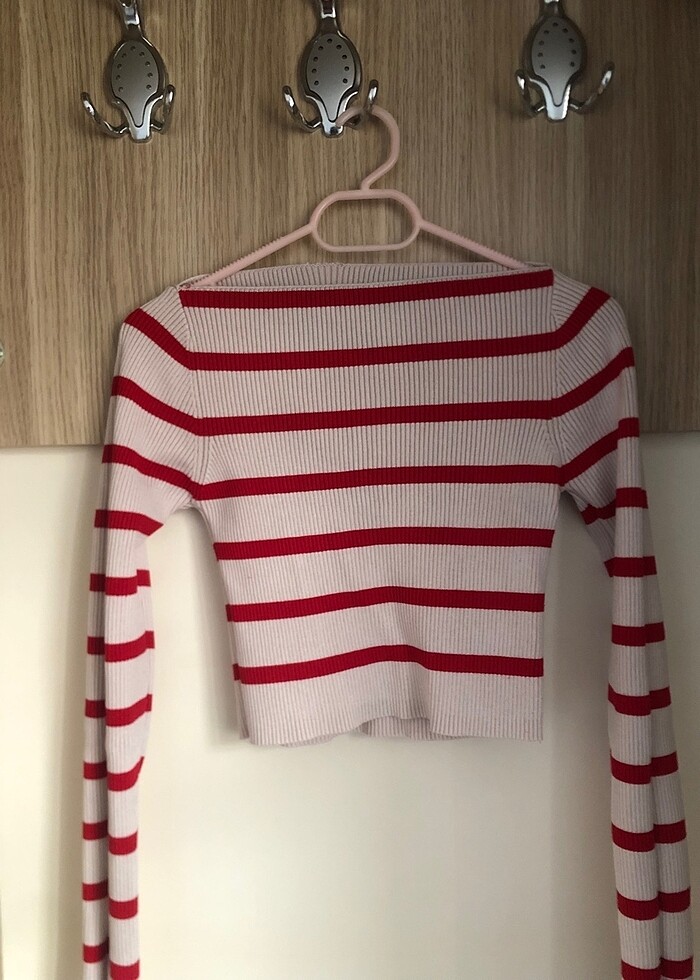 Pull and bear kısa üst kazak crop çizgili s beden pembe kırmızı