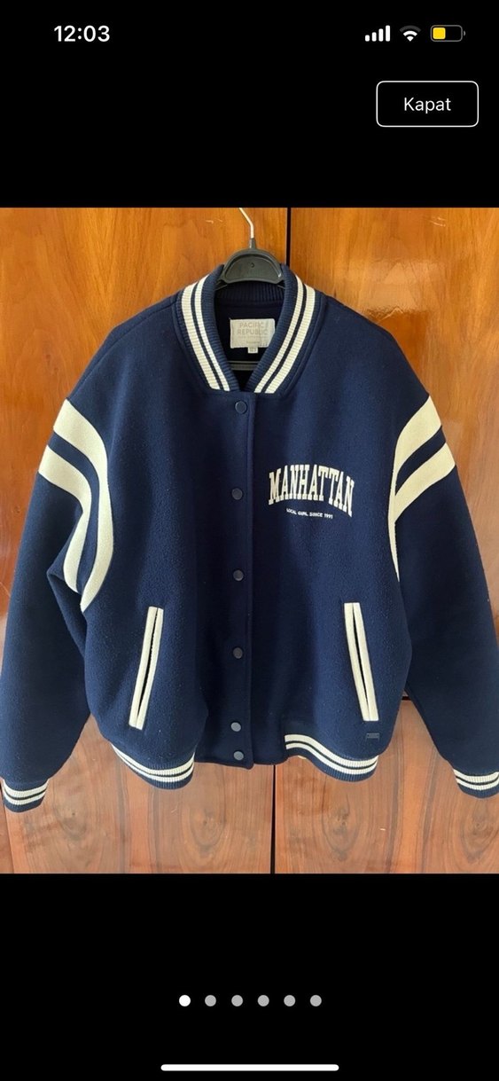 Mavi renkli, düğmeli, uzun kollu ve bol kesim kadın bomber ceket. Yumuşak ve sıcak kumaştan, baskılı detaylı, günlük kullanıma uygun. SAYILI GİYİLDİ