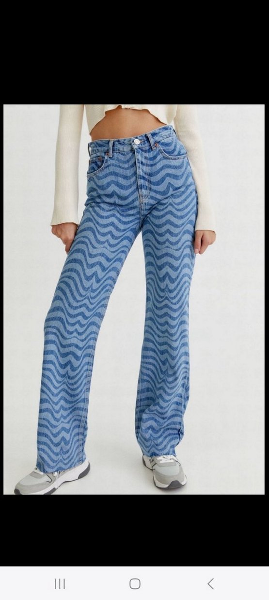 Mavi denim kumaştan, zebra desenli. günlük sokak modasına uygun. bir lekesi var aldığımda mevcuttu belli olmuyor giyince başka bir sorunu yok
