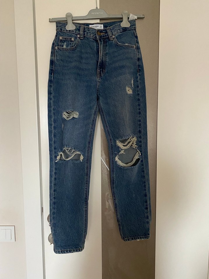 Lacivert renkli, yırtık detaylı, mom jean pantolon. Hiçbir kusuru yoktur.