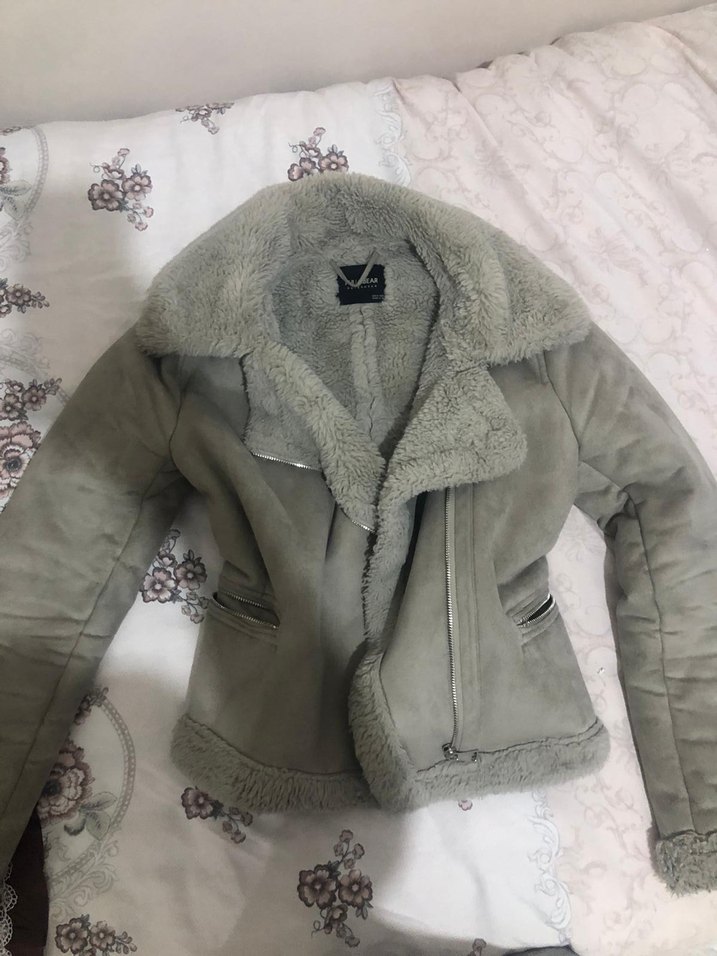 Gri süet kumaştan yapılmış, kürklü detaylara sahip, normal uzunlukta ve dar kesim kadın ceketi. Notlu yaka ve uzun kollu, günlük rahat stil için uygun.