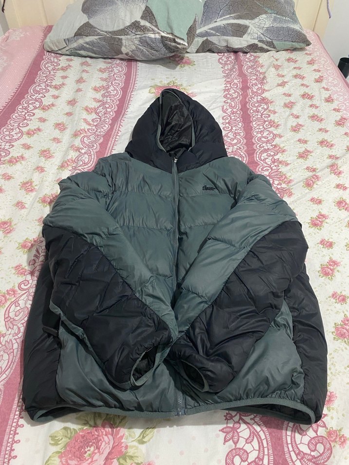 Kapüşonlu, koyu gri kışlık mont, uzun kollu ve fermuarlı. Normal boyda, vücuda oturan kesimiyle sıcak ve rahat bir kullanım sunar.