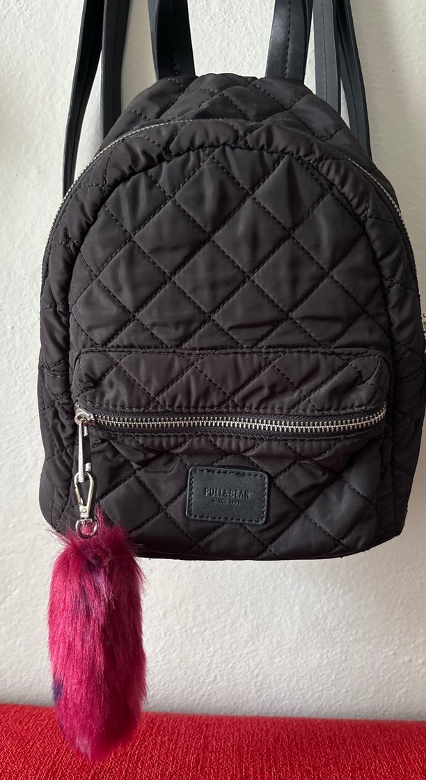Kadın sırt çantası, kapitone deseni ve pembe püskül aksesuarıyla dikkat çekiyor. Yumuşak ve sıcak kumaştan üretilmiş, ön fermuarlı cep içerir. Tabandaki kusurlar gösterilmiştir, askılarda minik açılmalar var