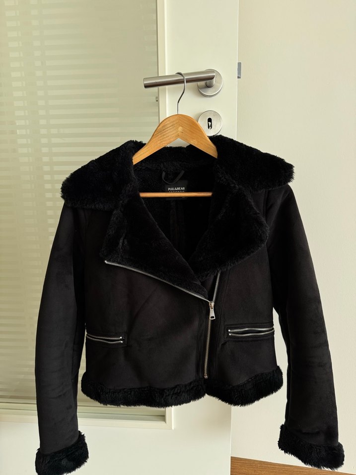 Fitted siyah süet biker ceket, yakada, manşetlerde ve etekte kürk detaylıdır. Notched lapel yaka ve asimetrik fermuar bulunur. Strappy kolludur, günlük kullanıma uygundur. S beden, çok az kullanıldı. Xs-s bedene uygun. Defosu yoktur