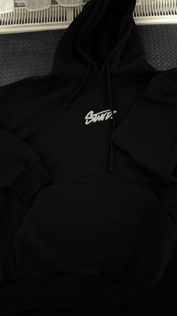 Siyah kapüşonlu, uzun kollu, bol kesim sweatshirt. Fermuarlı ve yumuşak kumaşlı, günlük kullanım için uygundur.