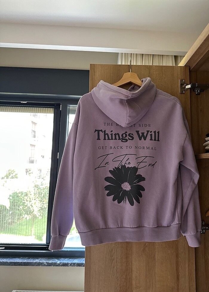 Kolunda çok küçük bi çamaşır suyu lekesi var (fotoğrafta var) onun dışında hiçbi kusur yok. Rengi lila kapüşonlu sweat S beden