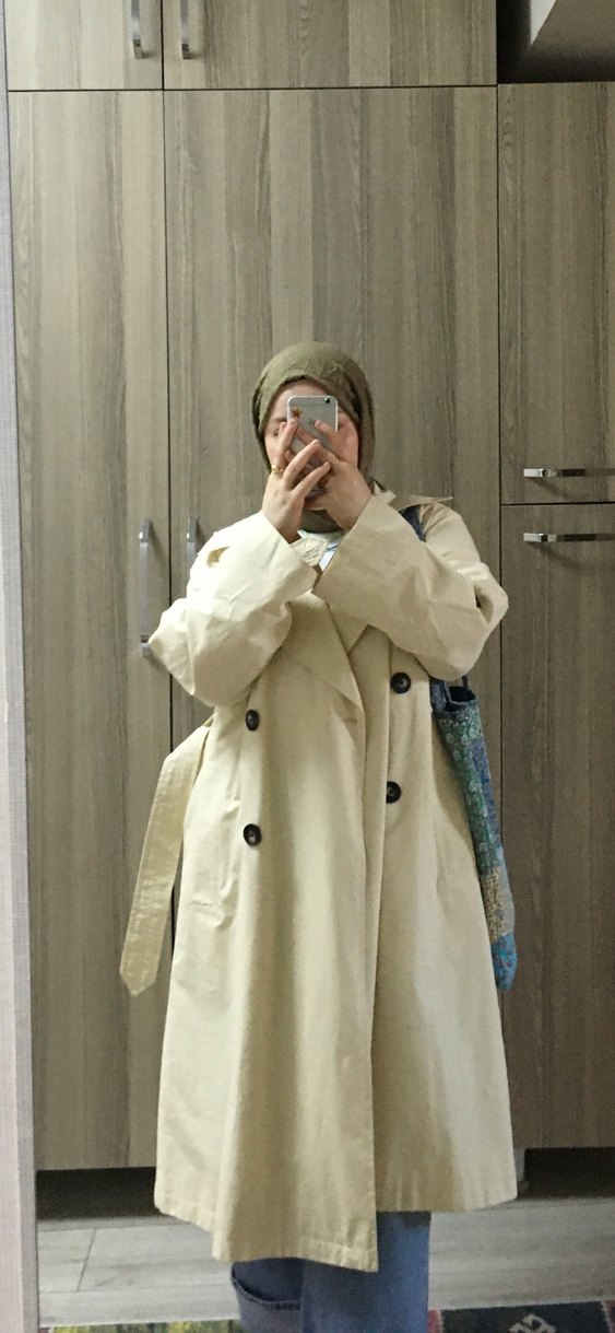 Pamuklu, uzun kollu, notalı yakalı bej midi trençkot. Rahat kesimiyle günlük kullanıma uygun, zahmetsiz şıklık sunar. sorunsuz. bol kalıp. birkaç kez kullanıldı.