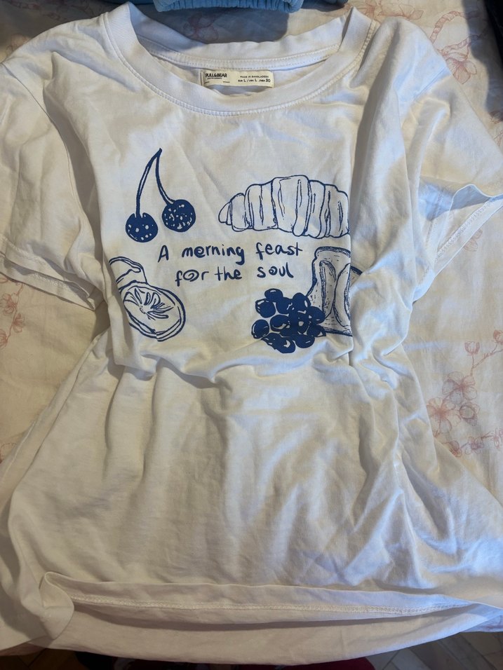 Beyaz pamuklu, kısa kollu, yuvarlak yakalı, bol kesim tişört. Üzerinde yiyecek çizimleri ve "A morning feast for the soul" yazısı baskılı.