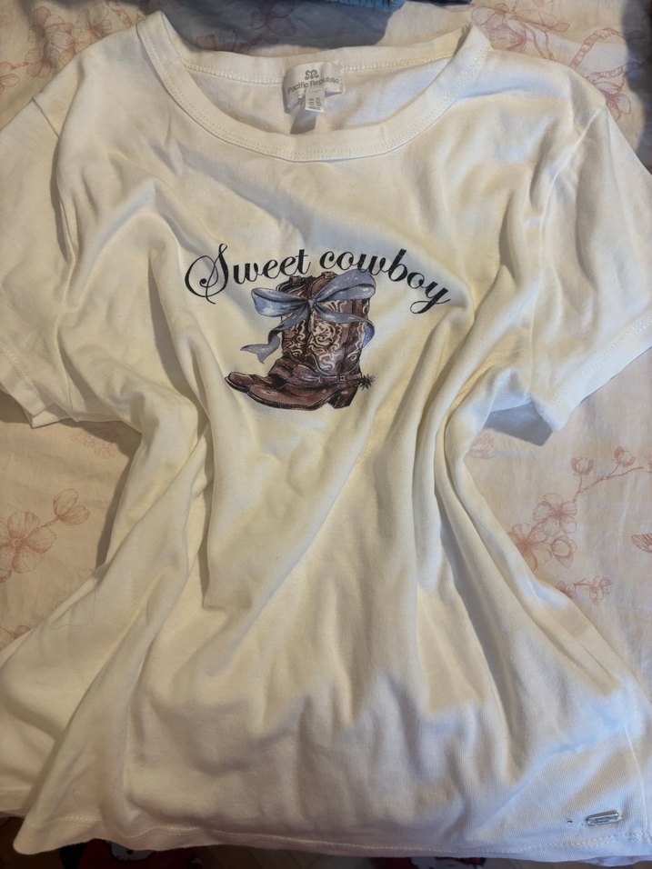 Pamuklu, kısa kollu, bol kesim beyaz tişört. Önünde 'Sweet cowboy' yazılı kovboy çizimi baskısı bulunur. Bohem tarzda, günlük kullanıma uygun.