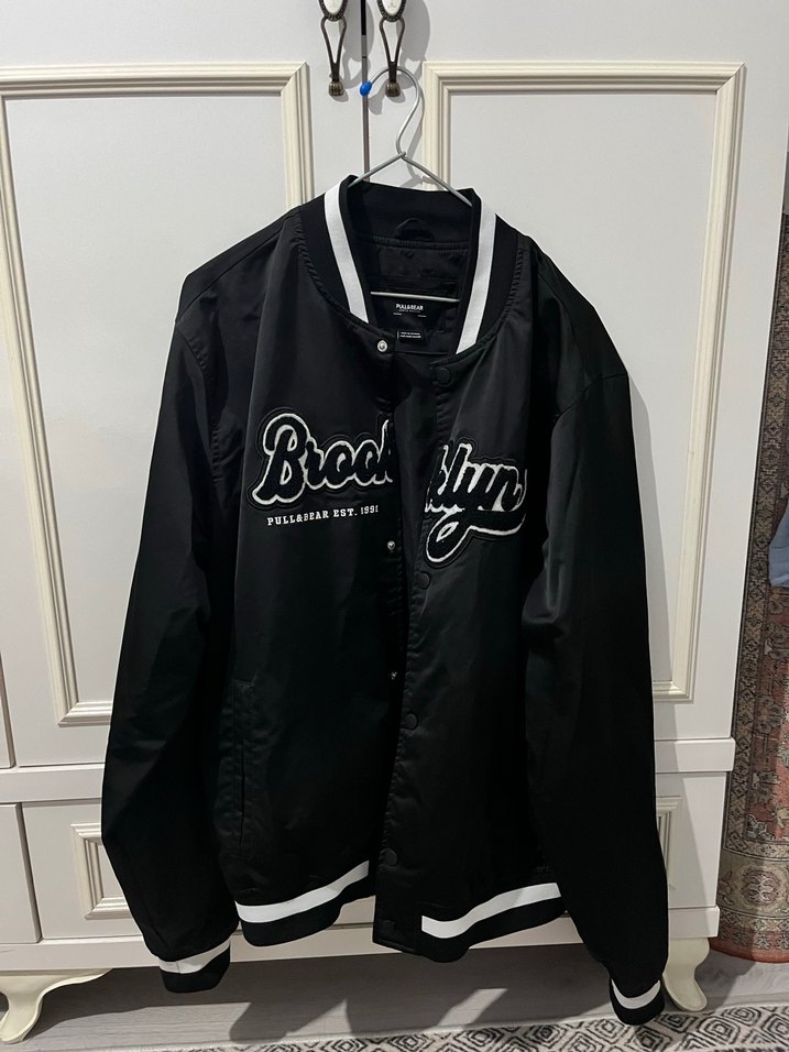 Siyah renkli, uzun kollu, düğmeli, bol kesim Brooklyn baskılı street wear ceket. Yuvarlak yaka ve sentetik kumaştan üretilmiştir.