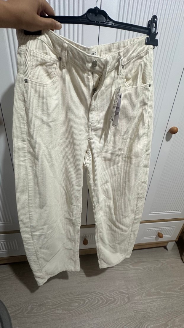 Düğmeli, beyaz renkli, pamuklu, bol kesim kadın kot pantolon. Normal boyda, desen içermeyen rahat bir tasarıma sahiptir. Günlük sokak stili için uygundur.