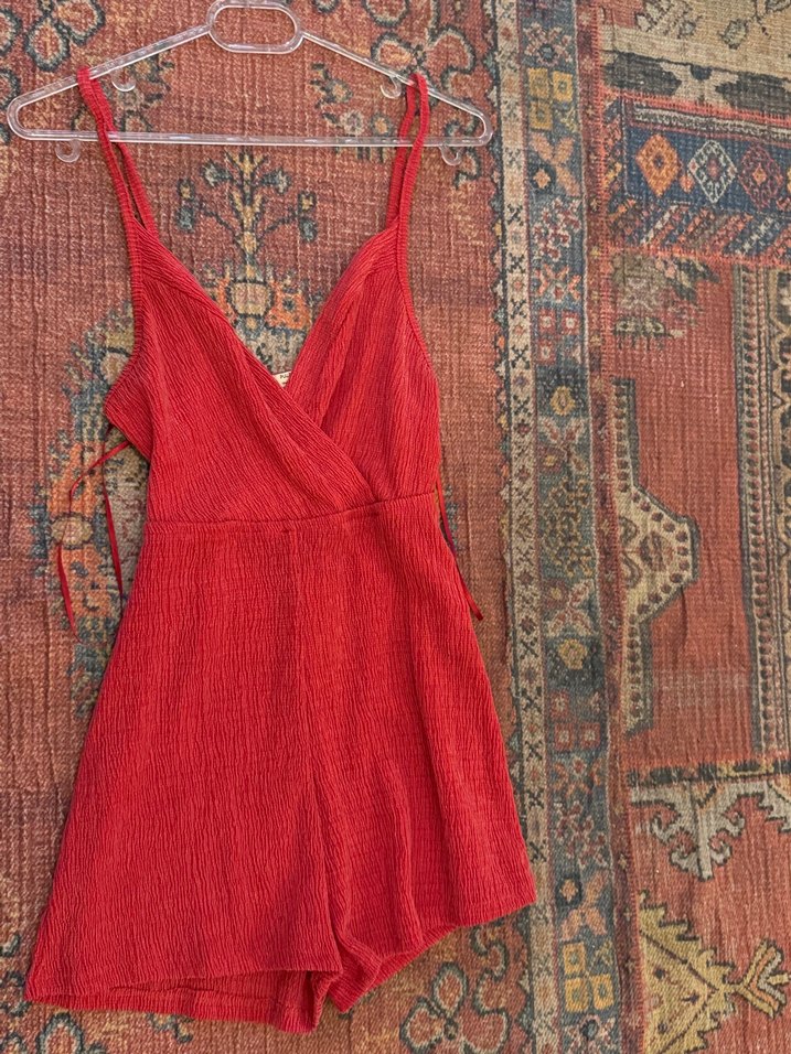 Pull&Bear 34 beren kırmızı askılı, kruvaze yaka ve drapeli tasarıma sahip kısa tulum. Yumuşak keten kumaş, çok rahat, bana askı kısımı uzun geliyor giyemedim yepyeni #tulum #pull&bear