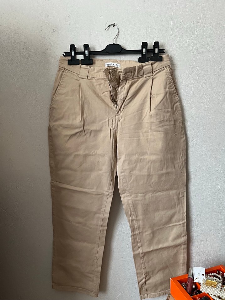 Bol kesim bej keten pantolon, günlük kullanıma uygundur bedeni 38 ama biraz bol o yüzden 40 bedene de uyumlu olur valizde beklediği için bu kadar kırışık hiçbir hatası yok çok az giyildi