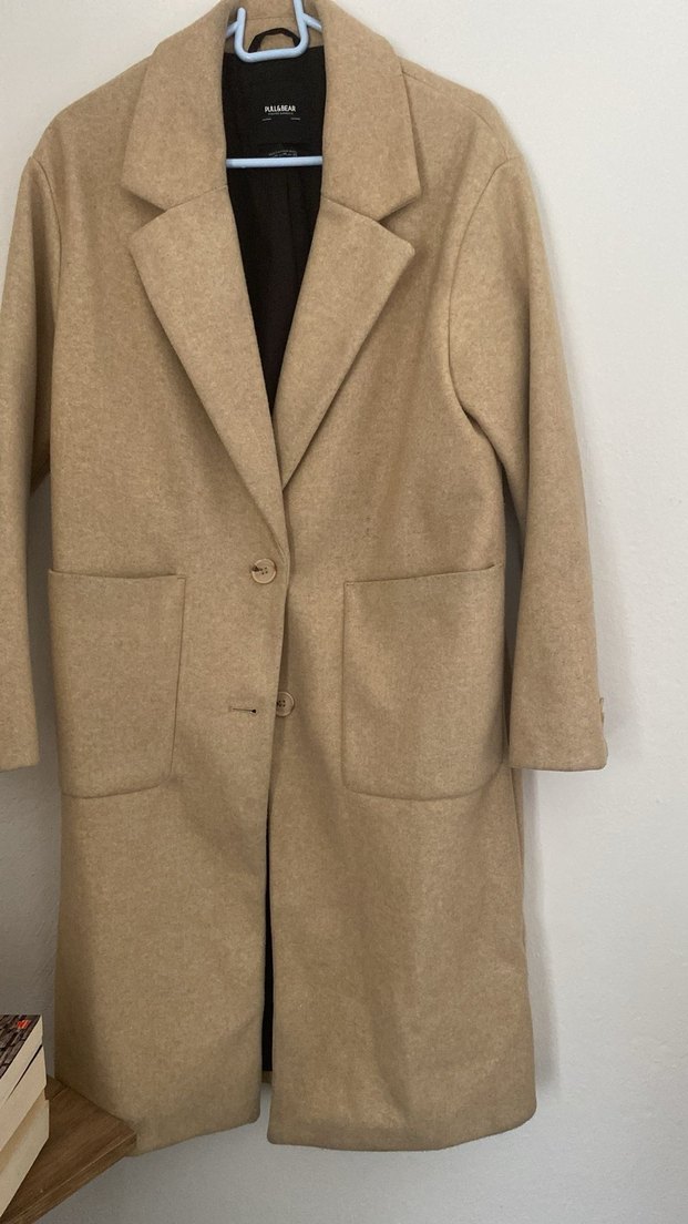 Klasik kesim, bej renk kaban. Zamansız modeli sayesinde günlük ve şık kombinlerde rahatlıkla kullanılabilir. Marka: Pull&Bear Renk: Bej Cepli model Düğmeli kapama Astarlı Durum: İkinci el, temiz kullanılmış.