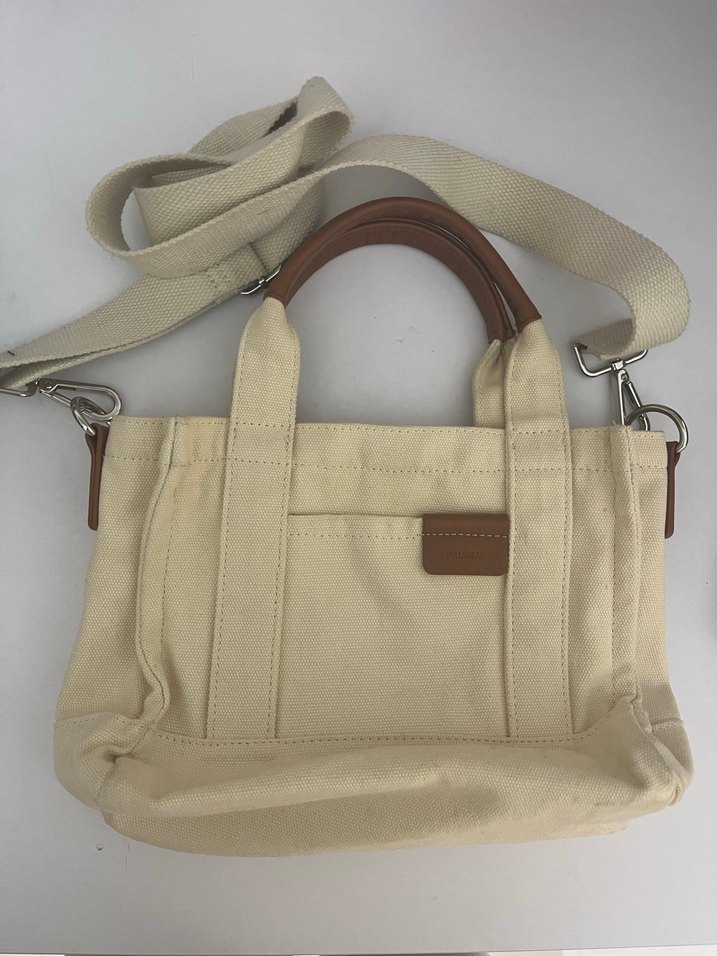 Bej sade tasarımlı kadın çantası. Kısa saplar ve çıkarılabilir uzun askı ile günlük kullanıma uygun şık bir seçenek. Hafif lekelenme mevcuttur.
