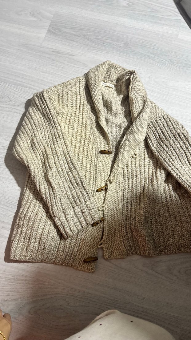 Pull&bear Bej renkli, kalın örgü kumaştan yapılmış, şal yakalı ve uzun kollu kadın hırkasıdır. Rahat kesimi ve midi boyu ile günlük kullanıma uygundur.