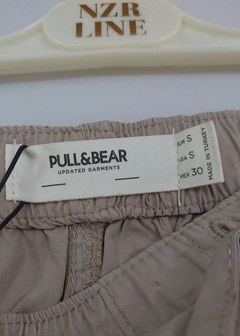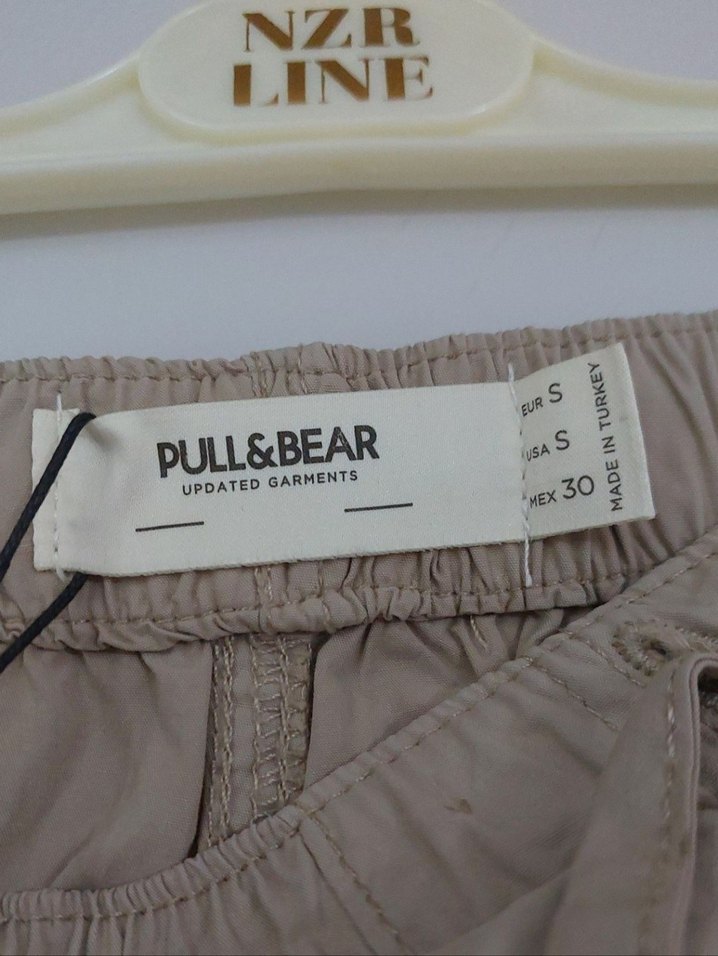 Yeni ve etiketli, bej renk Pull&Bear paraşüt pantolon. Paçalar büzülebilir ve kemer kısmı iplidir.