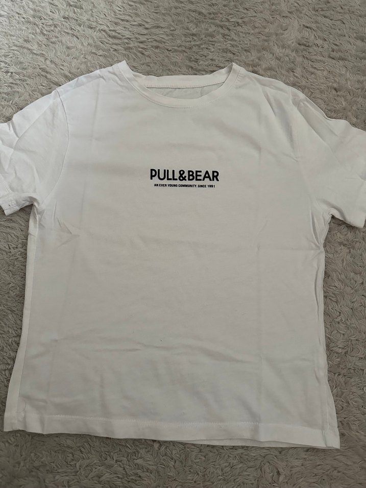 Pull&Bear marka, baskılı logolu beyaz tişört. Kısa kollu, yuvarlak yakalı, normal boyda ve bol kesim. Günlük rahat kullanım için uygundur.