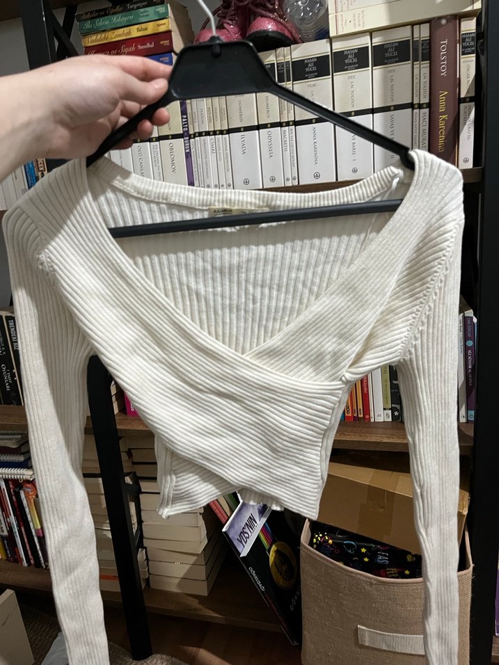 Beyaz renkli, V yaka kruvaze ve uzun kollu, triko kumaştan yapılmış, vücuda oturan kadın kazak. Rahat ve şık sokak stili için uygundur.