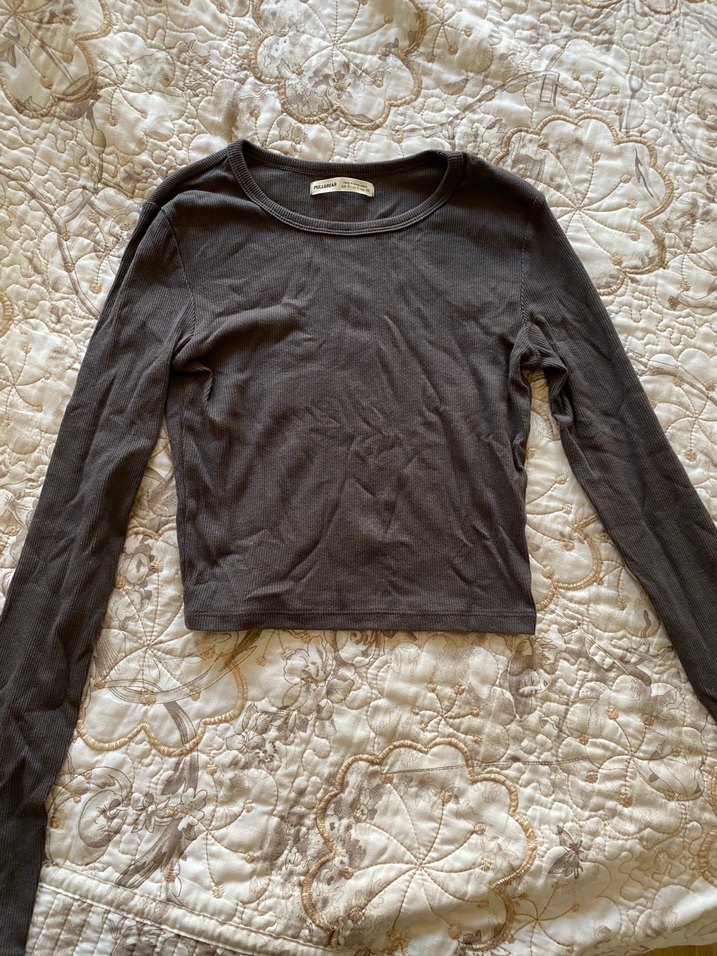 Kadınlar için uzun kollu, yuvarlak yakalı ve gri renkli, sade ve desen içermeyen, günlük kullanıma uygun basic tişört. Sadece bi kere giyildi croptur