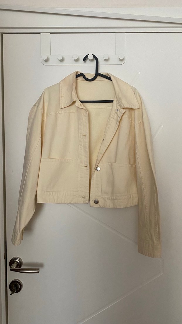 Bej keten kot ceket, düğmeli ve kesik yakalıdır. Uzun kollu ve regular fit modeliyle günlük sokak stiline uygundur.