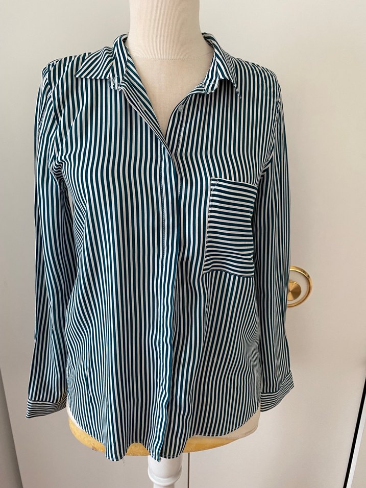 Mavi çizgili, uzun kollu, yakalı ve düğmeli kadın gömleği. Rahat kesimli ve tek cep detaylı,ip çekilmesi var o yüzden makul