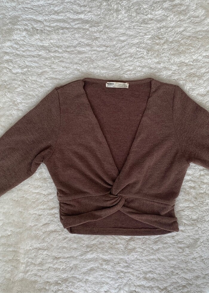 Pull&Bear marka düğüm detaylı triko kumaş crop kazak. Temiz üründür kalıbı dardır