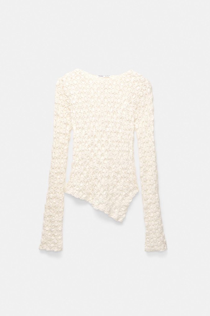 Beyaz kumaştan, uzun kollu ve bisiklet yaka kadın bluz Minimalist ve çağdaş tarzda, vücuda oturan kesimi ve asimetrik midi boyu ile günlük kullanıma uygun.