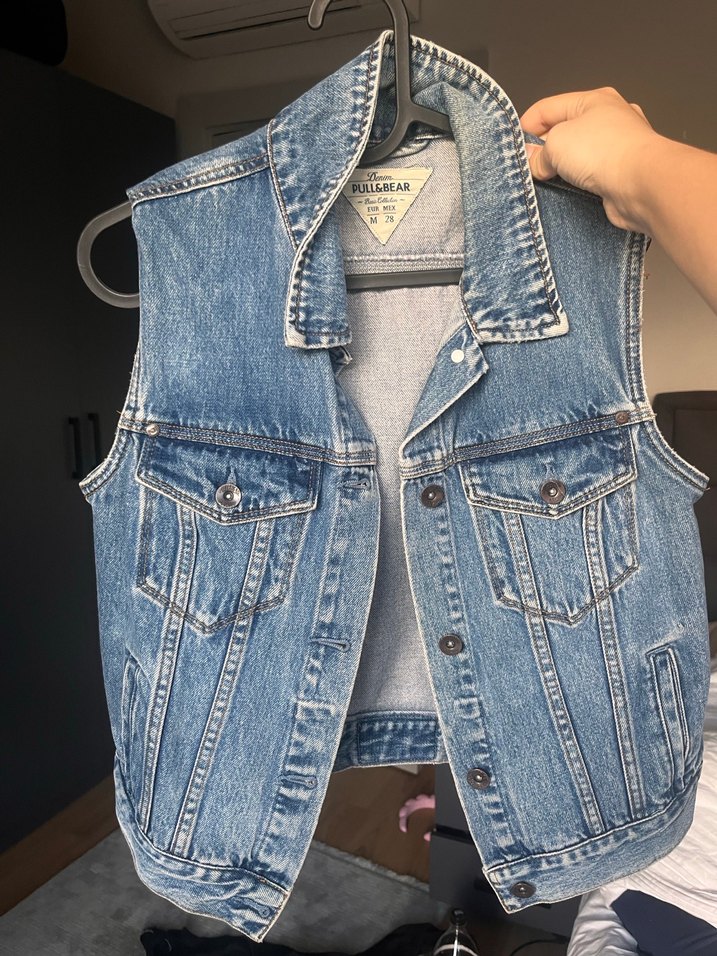 Düğmeli ön kısmı, yakalı ve iki göğüs cebi bulunan mavi kolsuz kot yelek. Sokak stiline uygun, vücuda oturan kesime sahiptir.