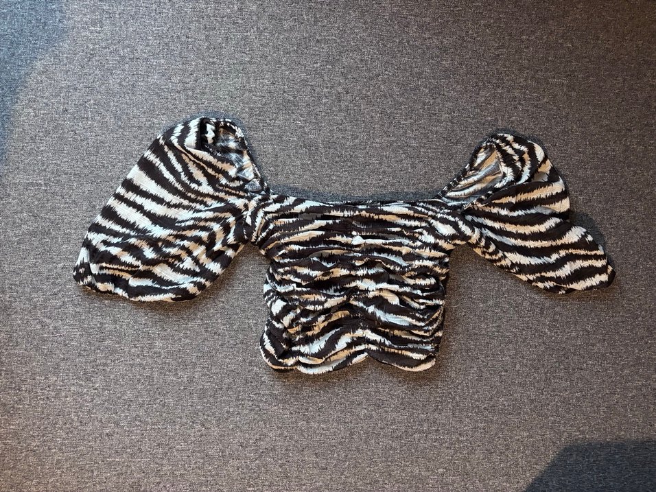 Zebra desenli, tekne yaka ve strappy kollu kısa bluz. Bohem ve retro tarzında dış mekan kullanımı için uygun.