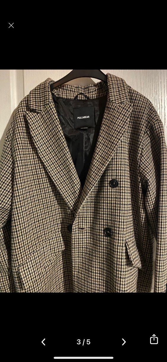Pull&Bear çift düğmeli ekoseli kaban, yakalı ve ön cepli, içi astarlı ve klasik tarzda.