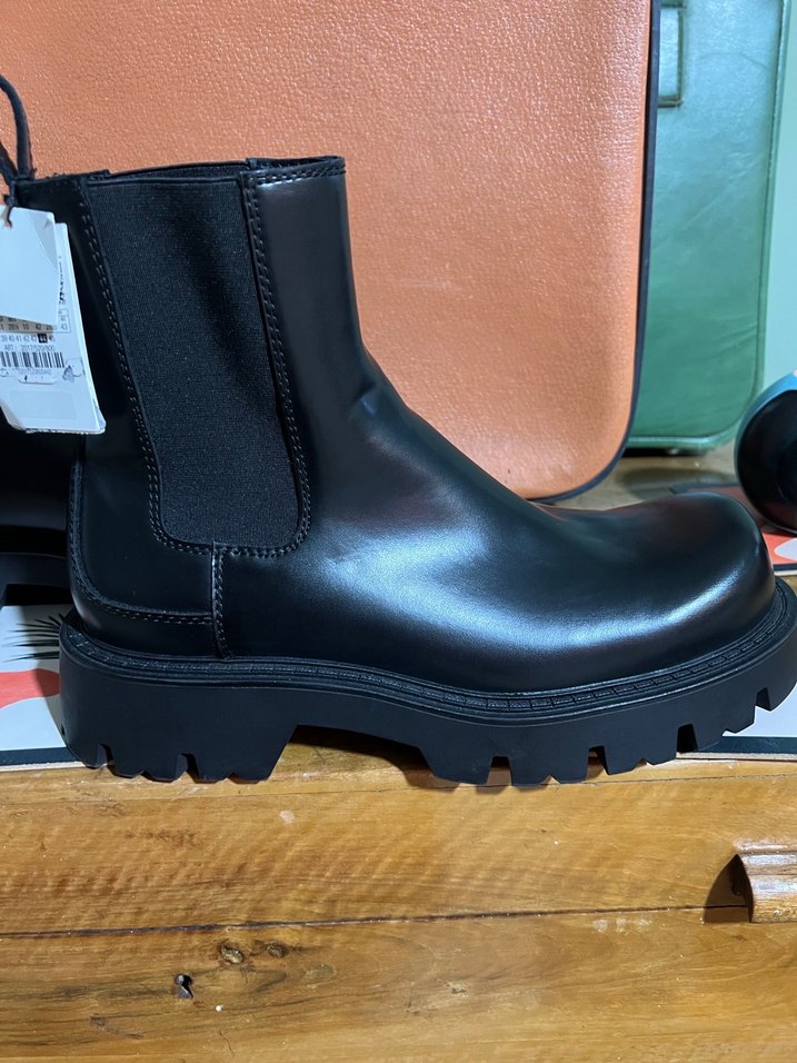 Siyah, lastik malzemeden platform erkek botu. Sokak stili ve günlük kullanım için uygun, sade ve deseniz tasarım.