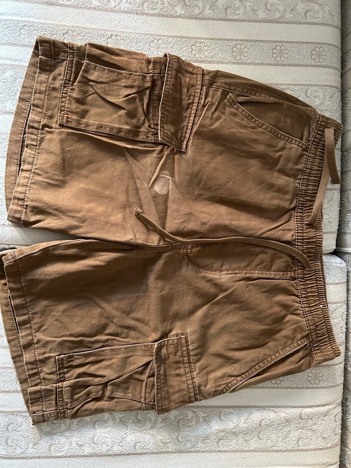 Kahverengi keten, bol kesim, kemerli midi uzunlukta erkek şortu. Önünde ve arkasında çamaşır suyu lekesi vardır